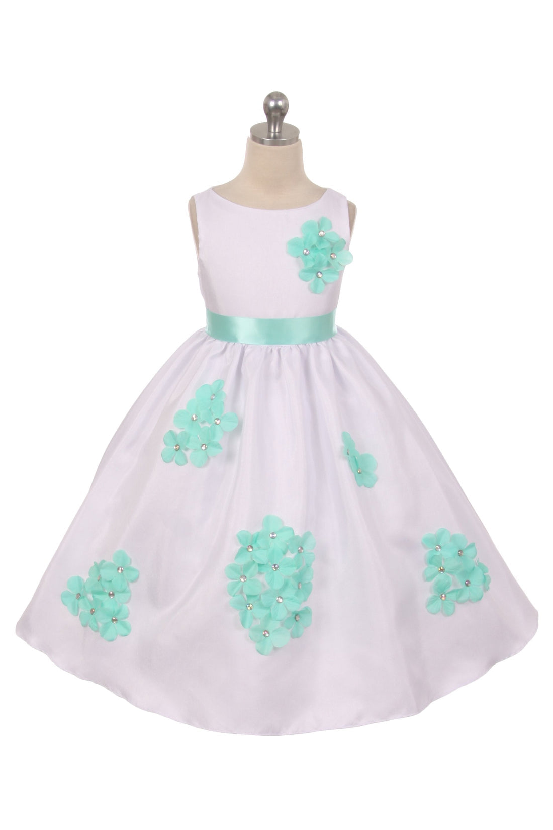 Shantung dress decorated with flower petals accented with a shiny gem.