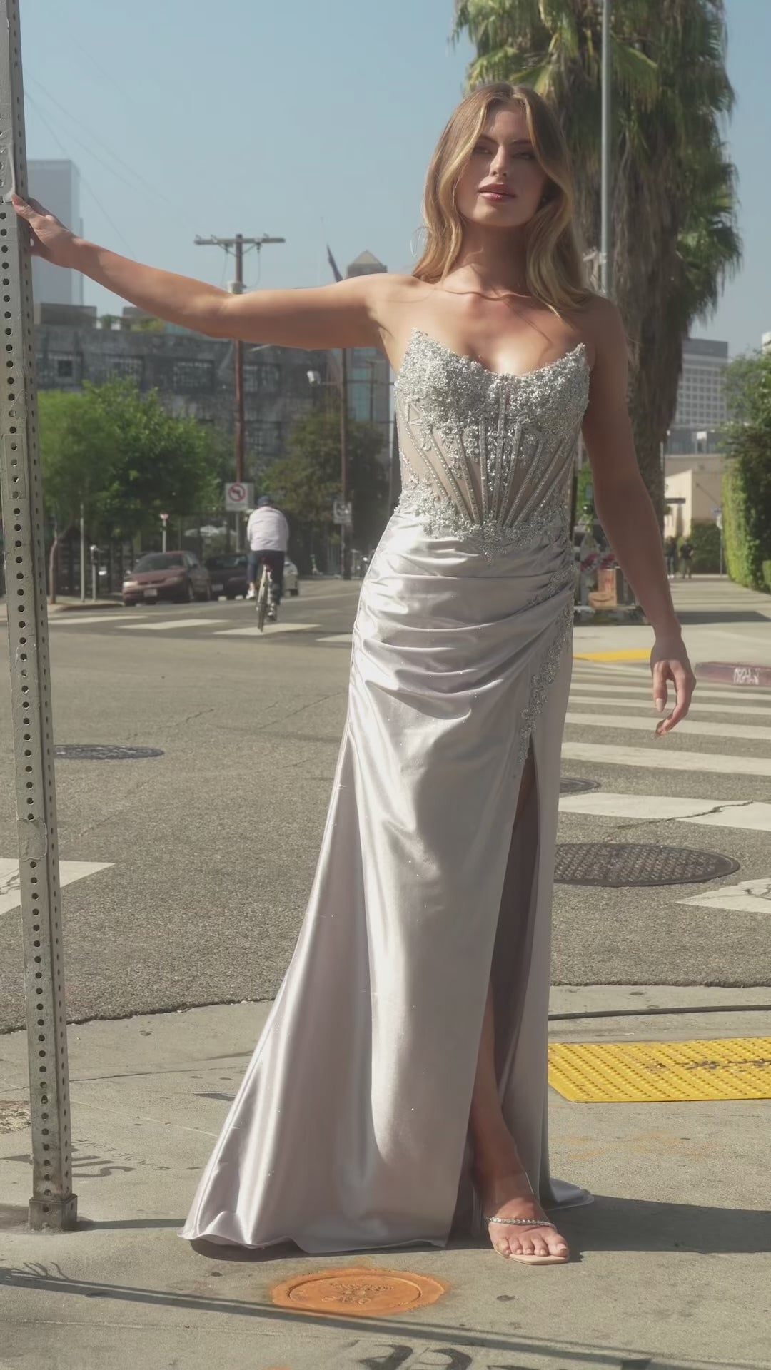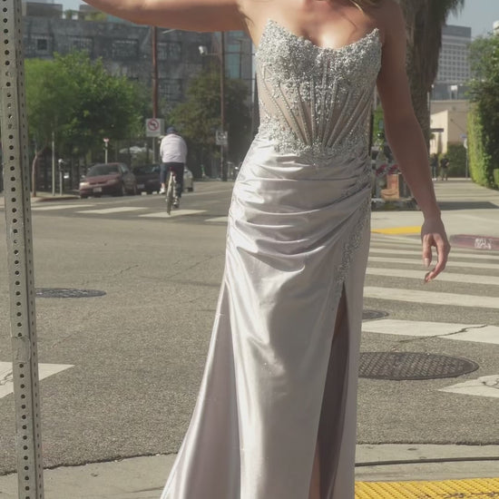 • Design: Strapless scoop neckline, beaded bodice & leg slit